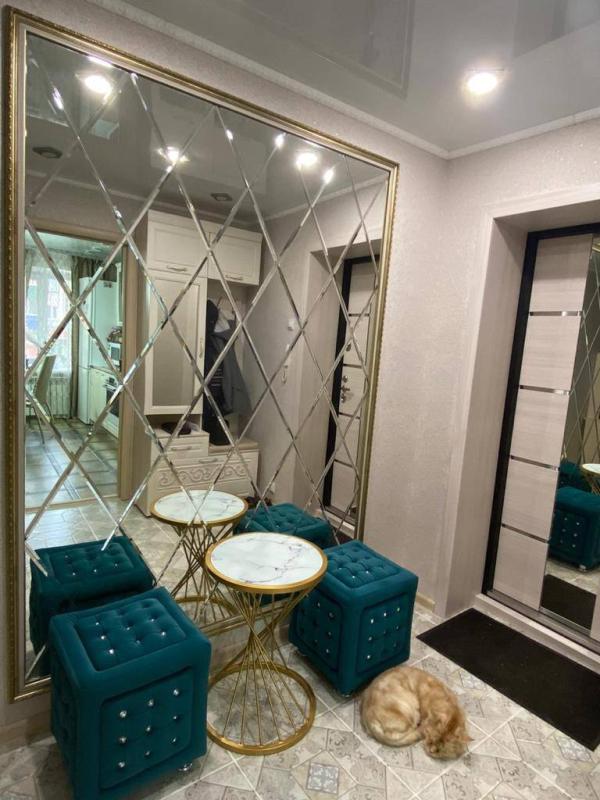 Использована квадратная серебристая зеркальная плитка размером 18х18.